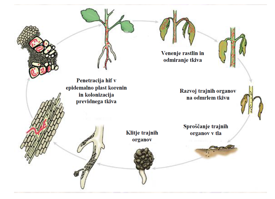 Vir bolezni so pogosto okužene sadike ali zemljišče, kjer so v preteklosti rasle okužene rastline. Prisotne mikrosklerocije v tleh aktivirajo koreninski izločki. Za uspešno kalitev in okužbo potrebuje gliva vlažna in topla tla, zato je pogosta na težkih, slabo odcednih tleh. Gliva prodre v korenine skozi poškodovano povrhnjico ali skozi koreninske vršičke, ter vstopi v ksilem kjer se razrašča. V ksilemu razvije trose, ki se s sokom širijo naprej po rastlini. Gliva sicer ne povzroča gnitja tkiva, kljub temu pa z micelijem, trosi in toksini uničuje in maši ksilemsko tkivo, kar povzroči zmanjšano prevodnost. Ob močnih okužbah se rastline posušijo zaradi pomanjkanja vode. S staranjem gostitelja prične gliva proizvajati mikrosklerocije (trajne strukture), ki se sprostijo v tla ob razgradnji rastlinskih ostankov. Bolezen se poleg okuženih sadik in mikrosklerocijev razširja tudi z vodo in vetrom.